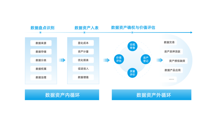 数据的资产运营,主要包括内循环和外循环。内循环的主要目标在于实现数据资产的会计入表,可以更精准地归集和核算与数字化投入相关的成本费用和收入,提高当期利润;外循环的基础目标是实现数据资产的登记及确权,最终顺利获得价值评估、数据产品交易等为经营给予可折现的现金流和长期增收的新渠道,增长潜力巨大。